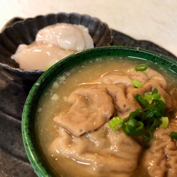 ホタテの塩ユッケと豚の大トロもつ煮。