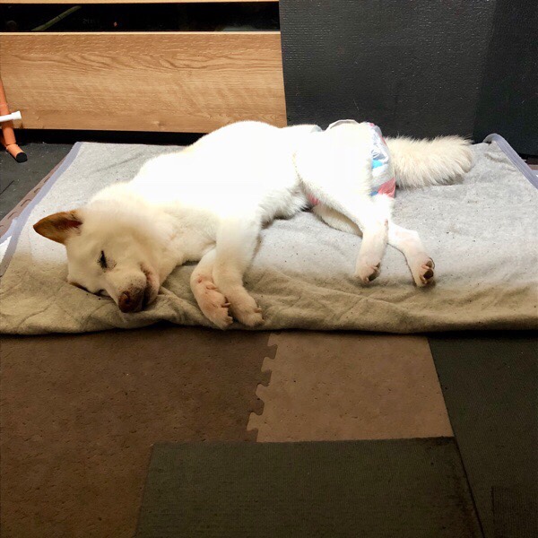ヒバ子さんも 御飯を食べまして、グッチ君は 一足先に 足元で 朝の お昼寝タイム💤