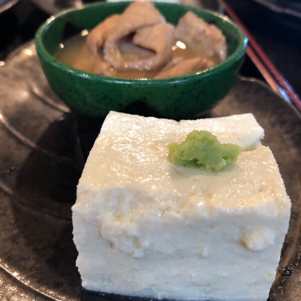 お通しは、こだわり豆腐のヤッコと豚の大トロもつ煮。