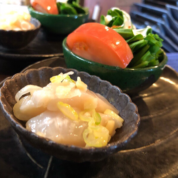 ホタテの塩ユッケと ほうれん草のシーザーサラダが お通し。