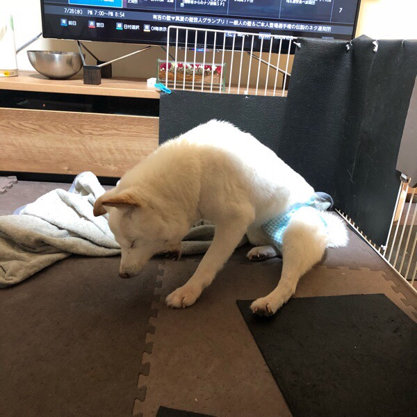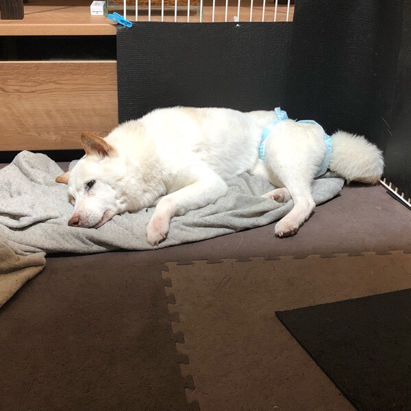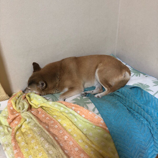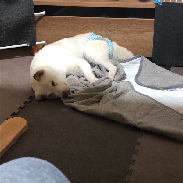 グッチおじーワンとリビングで 一緒に寝る生活となりまして、最初は ヒバ子さん側に 寝袋敷いて寝ておりましたが、今は グッチが 目の前に見える ソファーで 寝ている生活です😅
