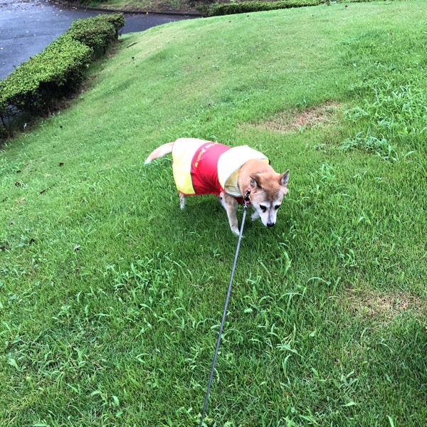レインコート着て、不満そうな ヒバ子さんの朝 。。。