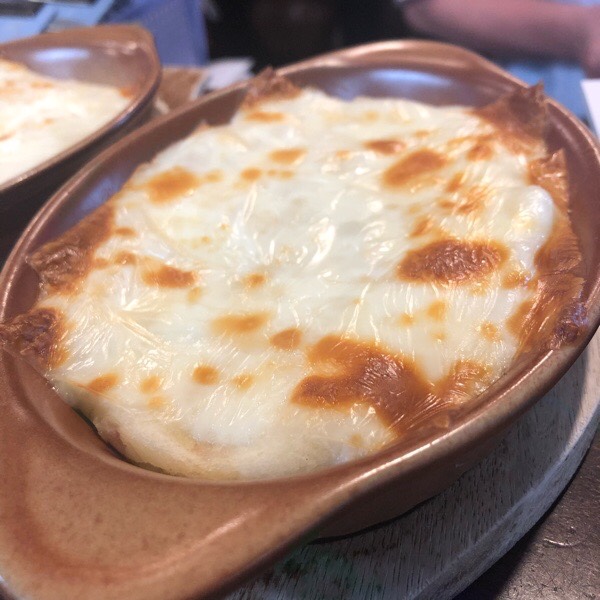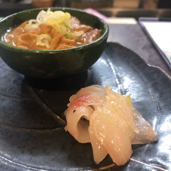 夕方5時に開店しまして、お通しは特製豚の大トロもつ煮とマナガツオの塩ユッケ。
