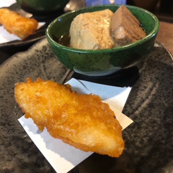 大間鮪の煮豆腐とマナガツオの唐揚げが お通し。