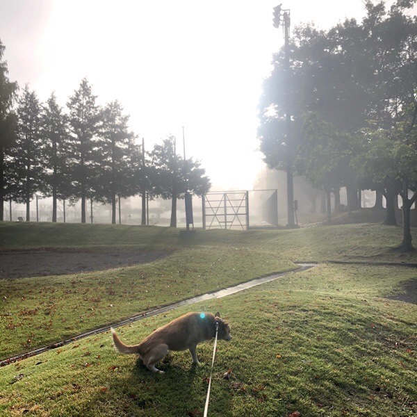 ヒバ子さんの お散歩は、霧とまではいきませんが、軽くモヤが かかってる感じでした🐶