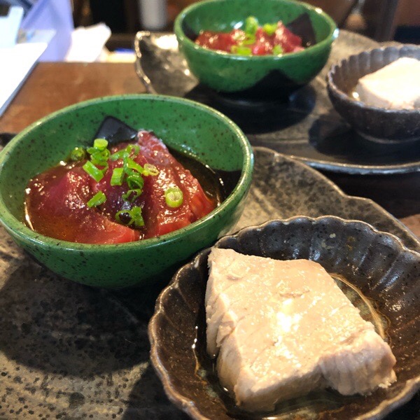 夕方5時となりまして、開店!マグロユッケと中トロ角煮が お通し。