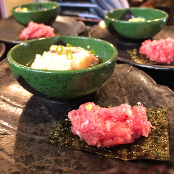 お通しは 煮豚バラ軟骨とネギトロ 塩ユッケ。