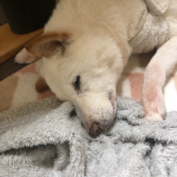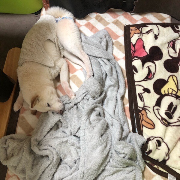 朝のグッチ君、お布団グチャグチャにして、お布団無しの端っこで寝ておりました😅