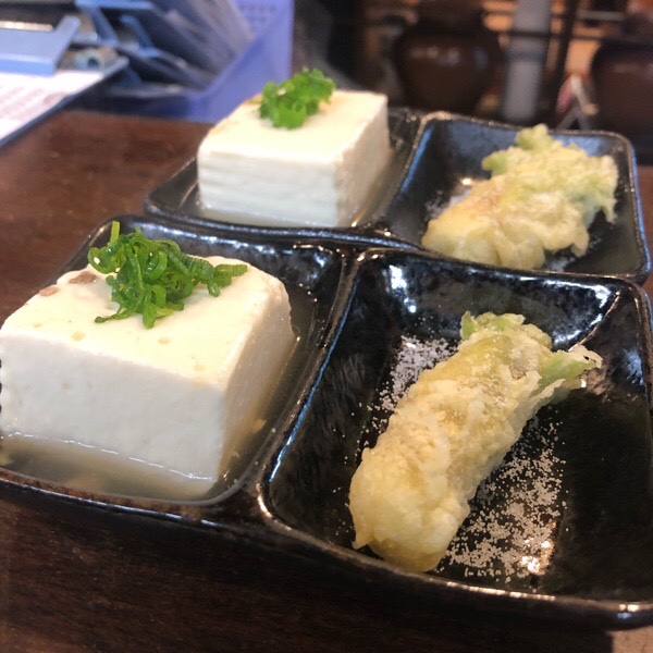 お通しは、豚軟骨出汁の煮豆腐とタラの芽の天ぷら。