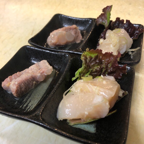 豚軟骨煮と帆立の塩ユッケが お通し。