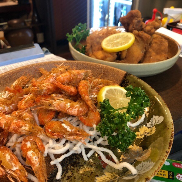 川海老の唐揚げと骨付きモモ肉の唐揚げ。