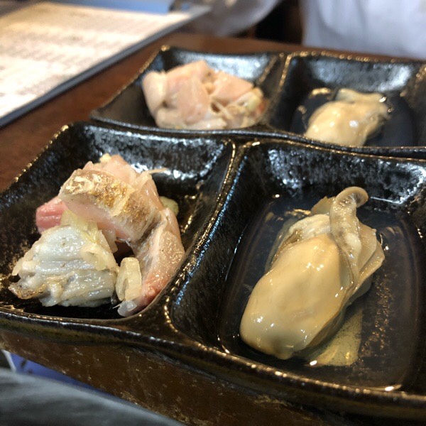 お通しは、太刀魚の塩ユッケと煮牡蠣。