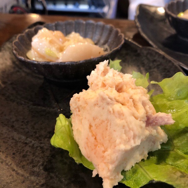 お写真、お通しの明太ポテトサラダ と帆立の塩ユッケ。