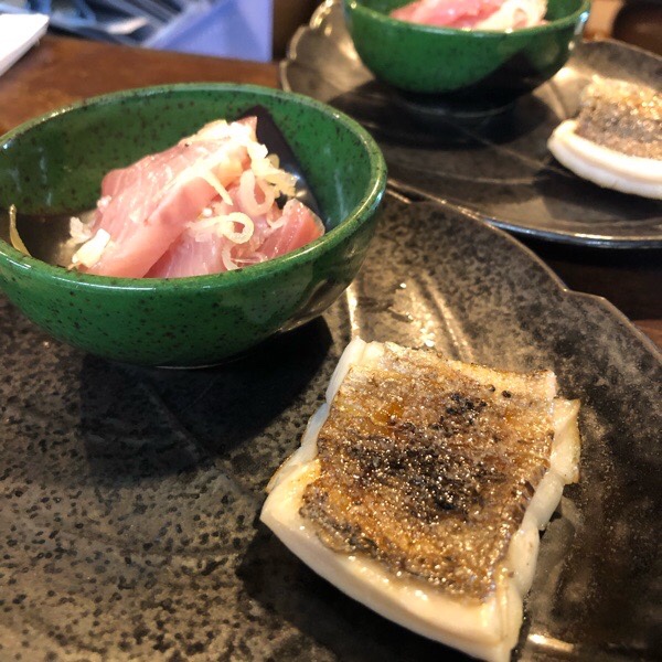 御予約様、御来店下さいまして 太刀魚の塩焼きと寒鰤塩ユッケの お通し。