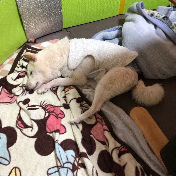 一度起きだしましたが、またまた疲れちゃったか、二度寝のグッチおじーワンでした🐶