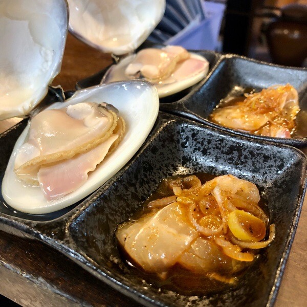 入荷したモノをお通しで出しちゃおう作戦で、蛤の酒蒸しと真鯛のユッケの お通し。