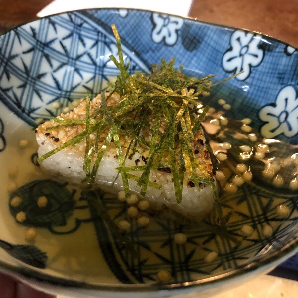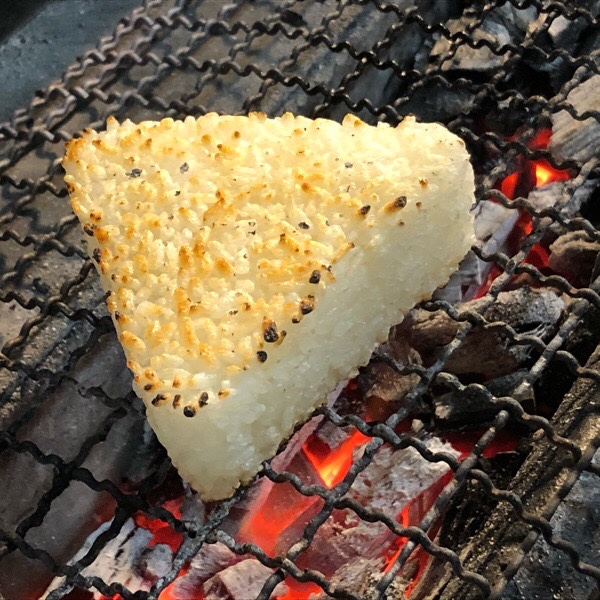 〆タイムは、炭火でオニギリ焼きましてのー。