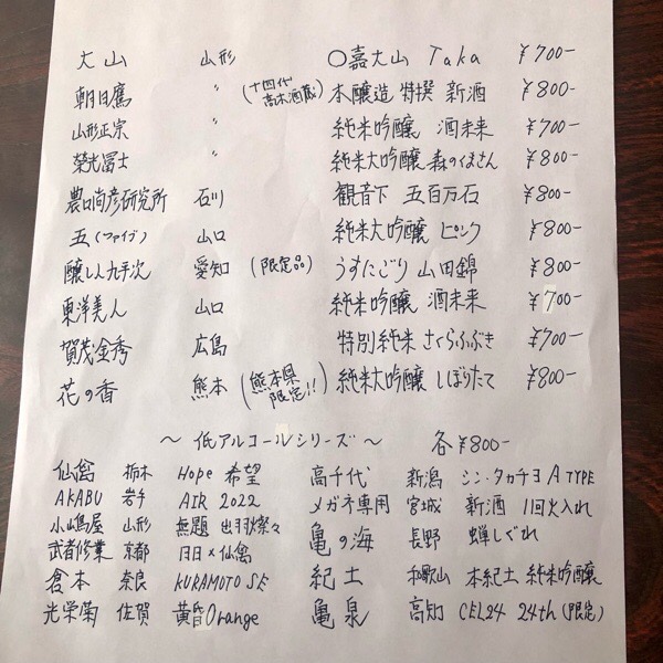 低アルコールを纏めてみる感じにしてみたり、結果的に 買い付けました日本酒を全てメニューに入れちゃいました(((o(*゚▽゚*)o)))