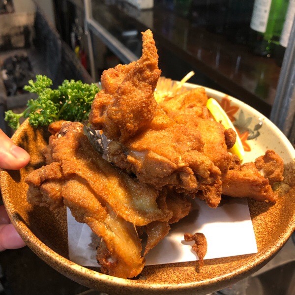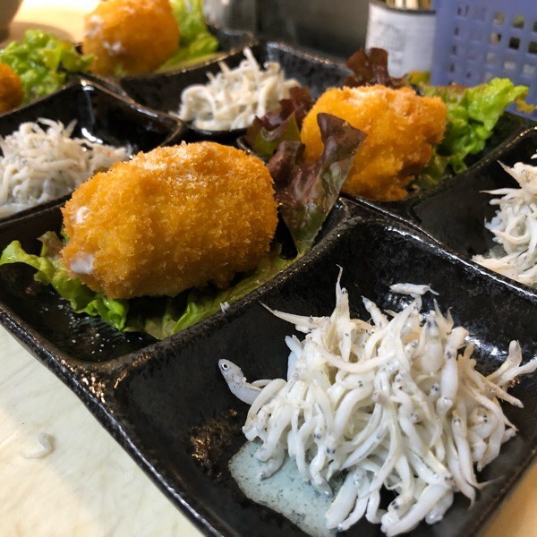 お通しは、釜揚げしらすと河豚の白子のフライ。