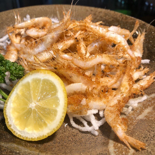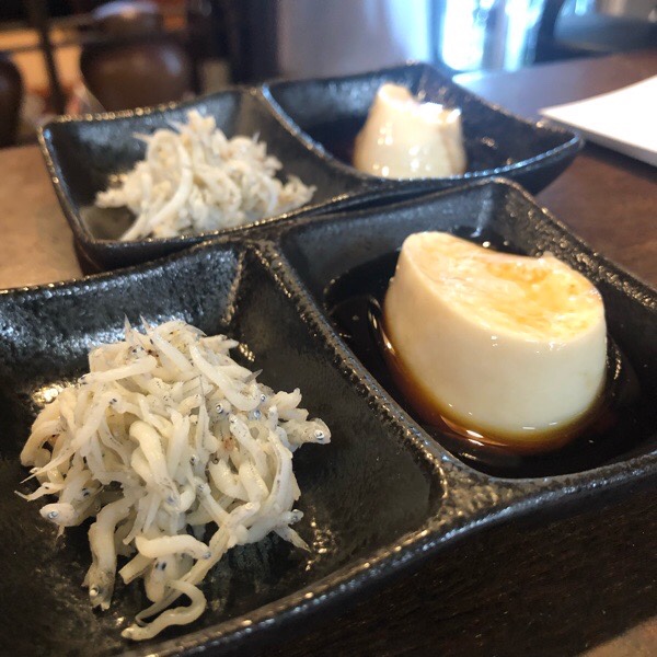 お通しは、釜揚げしらすと河豚の白子ポン酢。