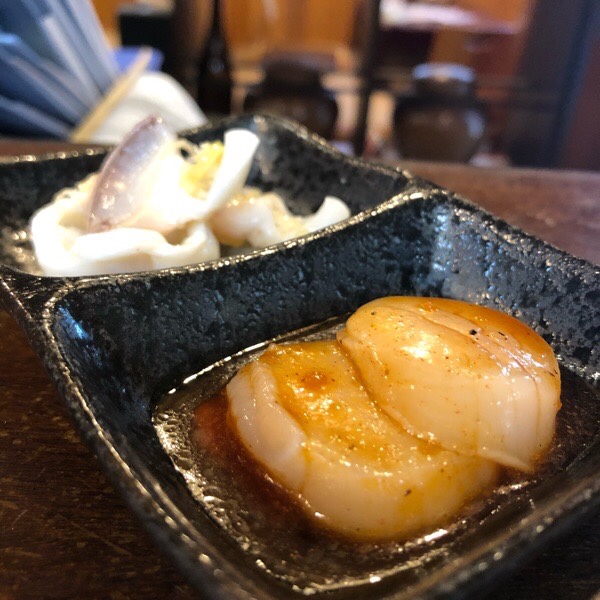 話は戻りまして、帆立のユッケとガーリックタコが お通し。