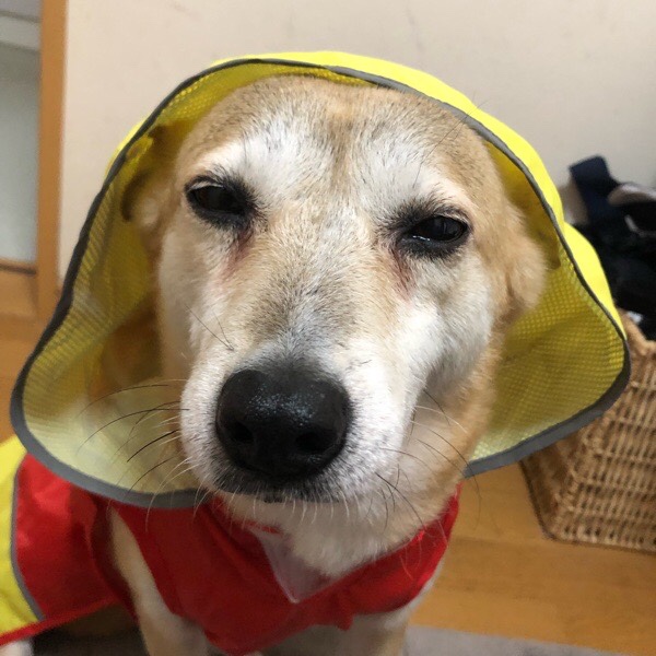 レインコート着せられて、お目目が素直なヒバ子さんでございます🤣