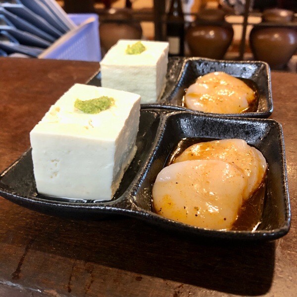 開店しまして、お通しは こだわり豆腐のヤッコと帆立のユッケ。