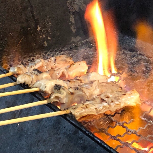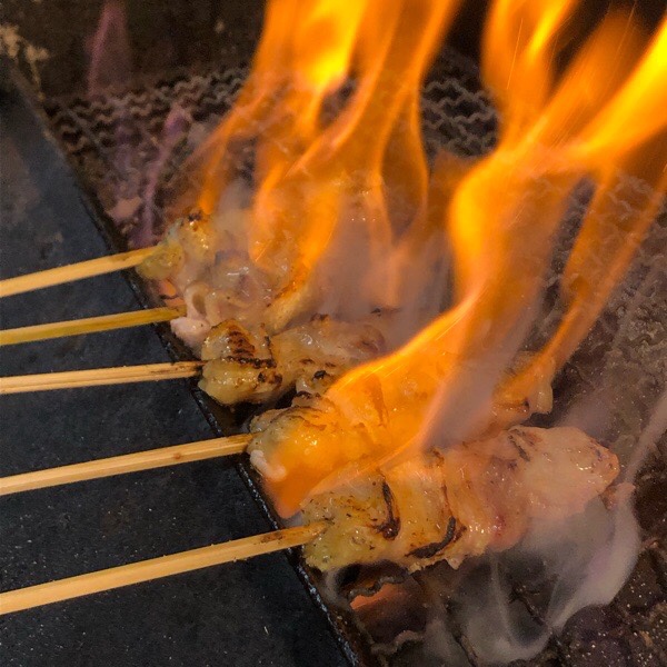 炎を上げて 主役の炭火焼きとり。