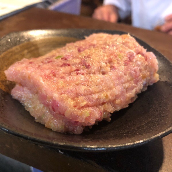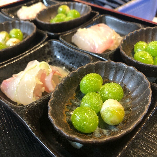 真鯛の塩ユッケと揚げ銀杏の お通し。
