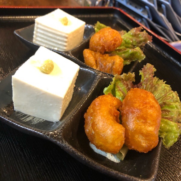 こだわり豆腐のヤッコと鱧の唐揚げが お通し。