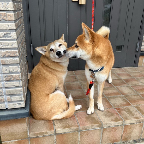 お散歩から帰って来まして、早く お家に入りたい ヒバ子さんと、まだまだ お外で遊びたいリリ小僧😆