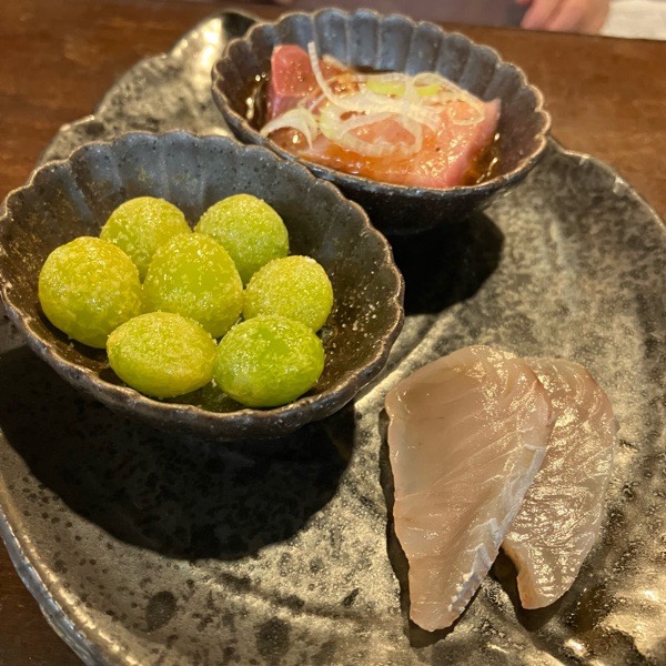 鰤のユッケ、新銀杏、鰆の塩〆が お通し。