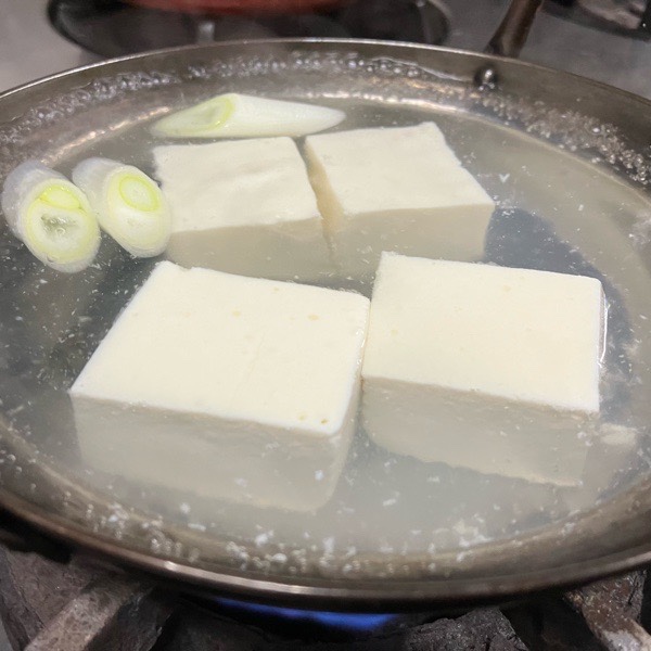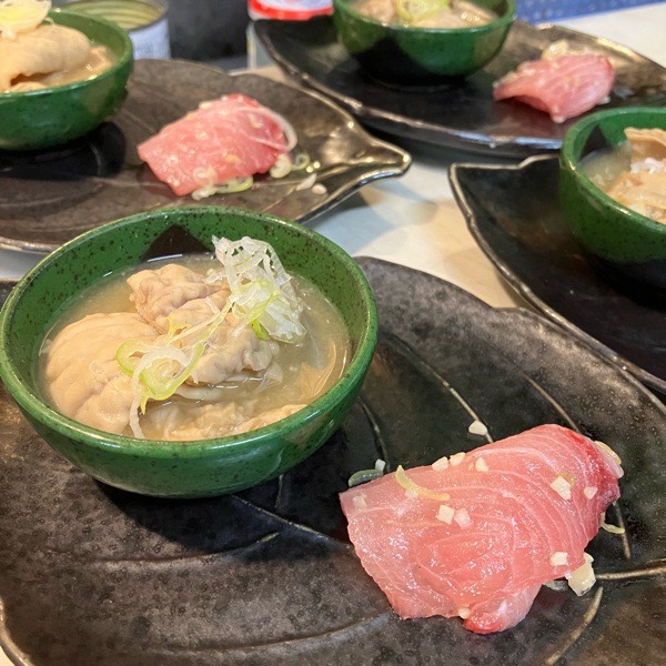 お通しは、特製 豚の大トロもつ煮と鰤の塩ユッケ。