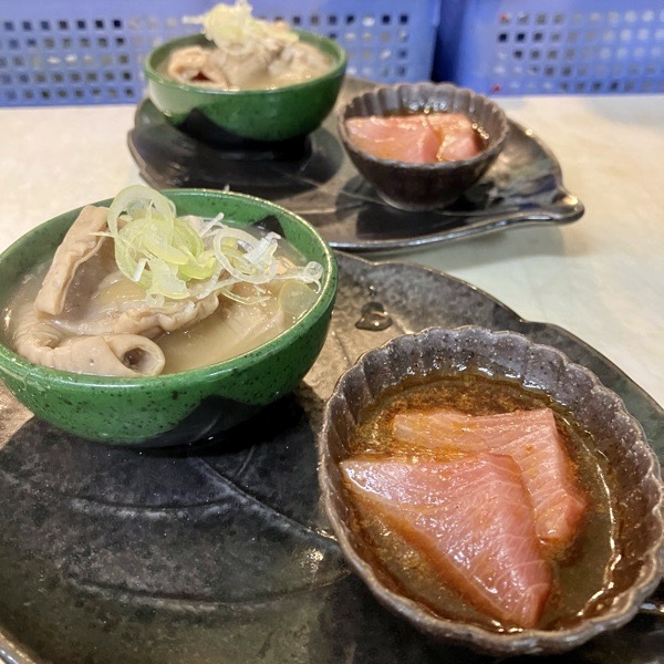 開店しまして、お通しは 豚の大トロもつ煮と鰤ユッケ。