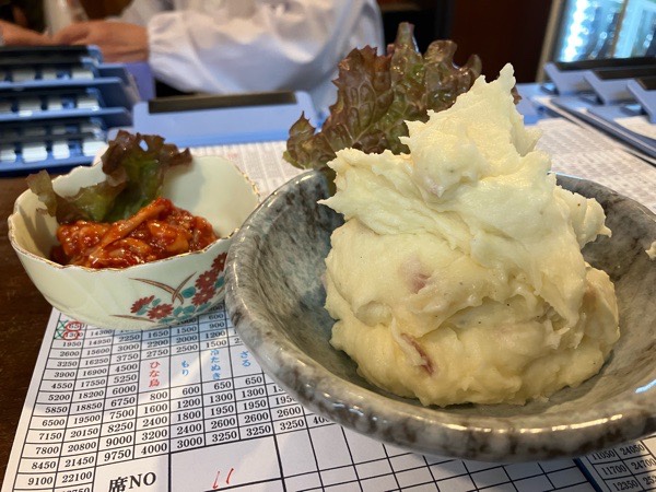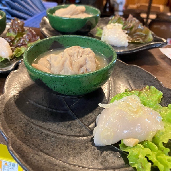 お通しは、豚の大トロもつ煮と帆立の塩ユッケ。