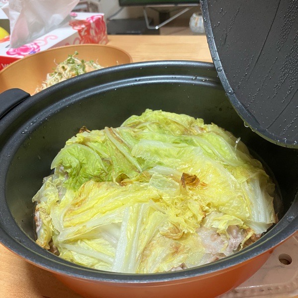 夜の晩酌タイムは、豚バラ白菜鍋。