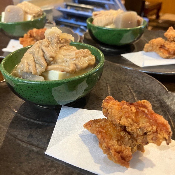 豚の大トロもつ煮と軟骨唐揚げからの お通し。