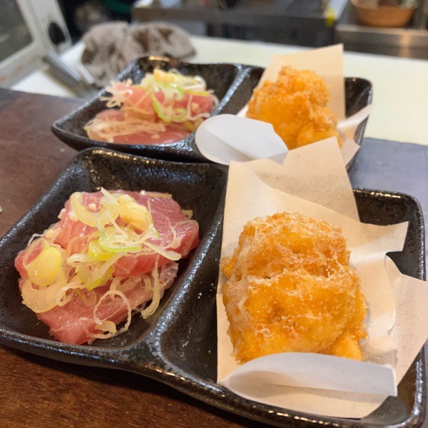 鰤の塩ユッケと白子フライが お通し。