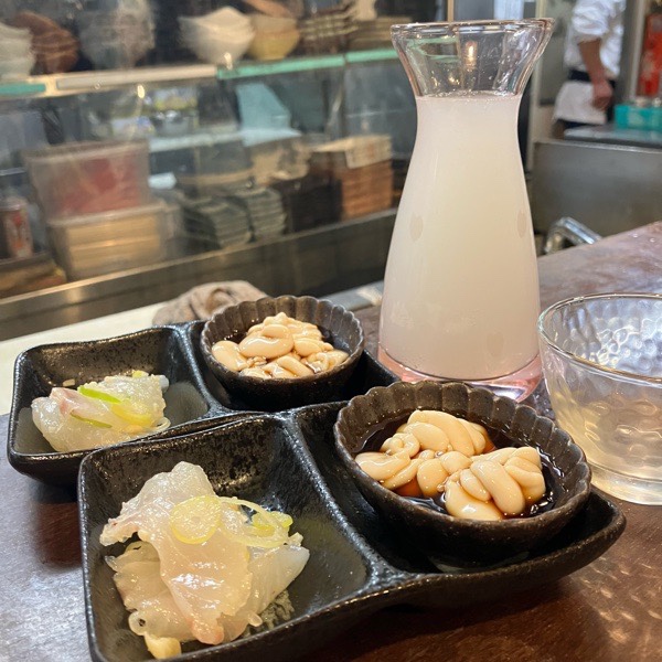 フエフキダイの塩ユッケと白子ポン酢が お通し。