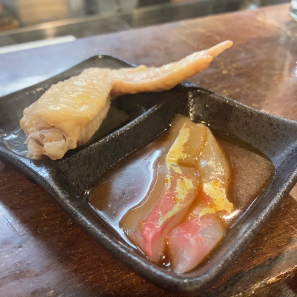 手羽先煮と汐子のユッケが お通し。