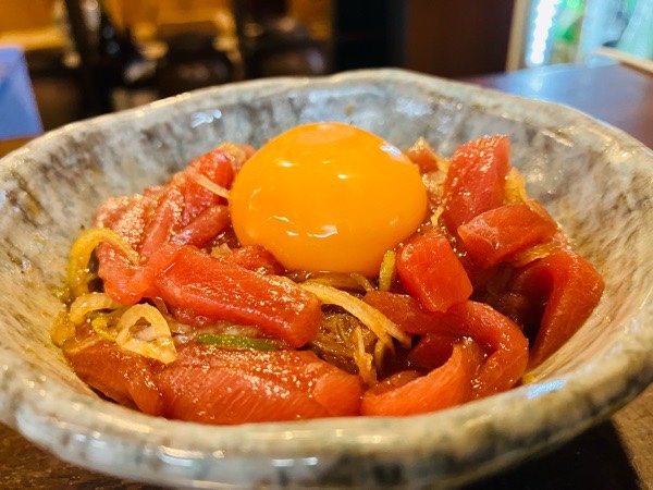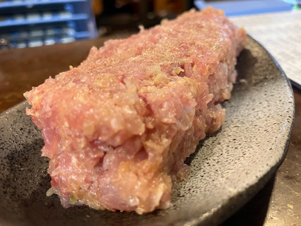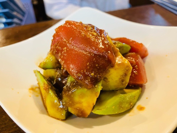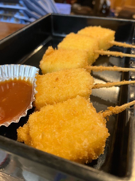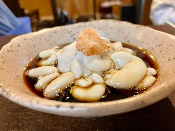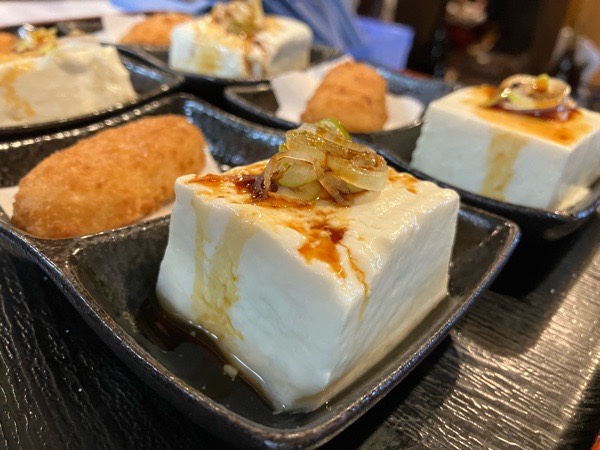 お通しは、チキンカツと こだわり豆腐の湯豆腐。