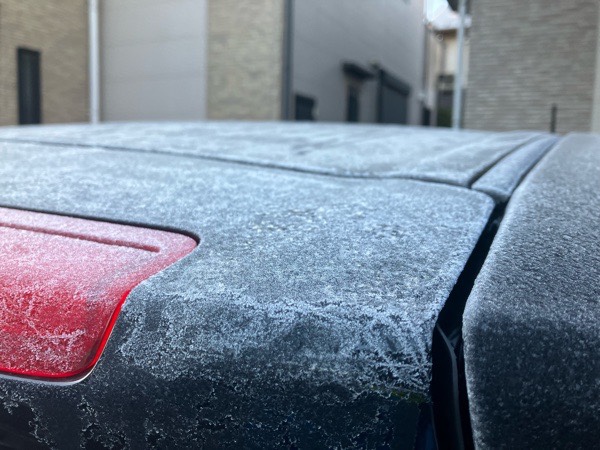 お散歩から帰って来まして、寒いなーと思いましたら、車の屋根がガチガチに凍っておりました😱