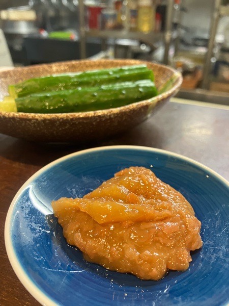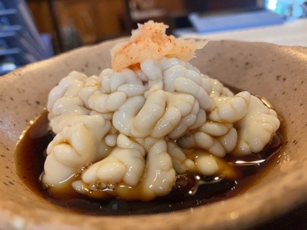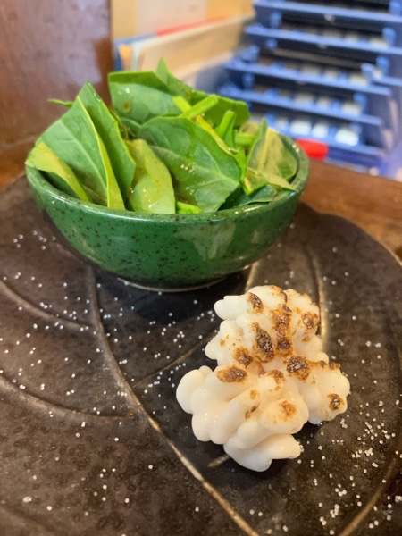 ほうれん草の和風サラダと白子の炙りが お通し。