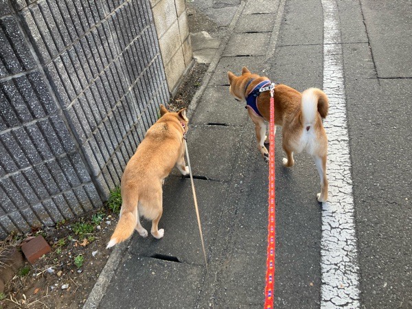 お散歩から帰って来まして、まだまだ やる気満々のリリ君と、一刻も早く お家の中へ入りたい ビビリのヒバ子さん🐕