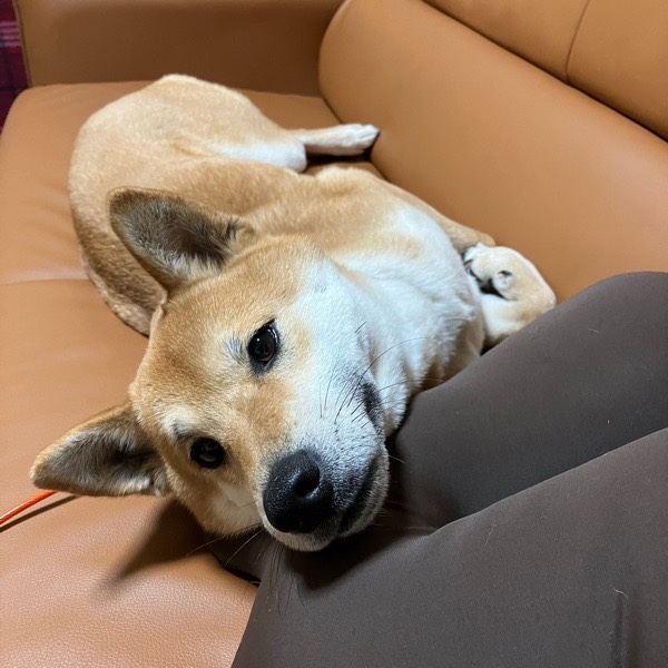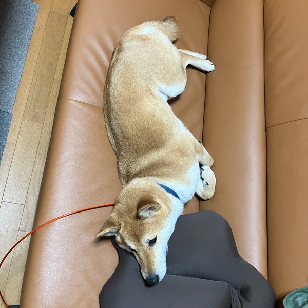 皆んな御飯を食べまして、出発準備をして リビングへ戻りますと、お坊ちゃまが一人でソファーを陣取っておりました😅