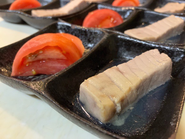 お通りは、スペシャルなフルーツトマトと中トロ角煮からー。