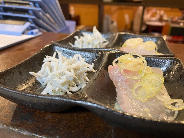 釜揚げしらすとメジナの塩ユッケが お通し。
