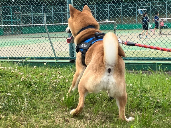 リリ君を抱っこしまして、テニスが見えない所までー!