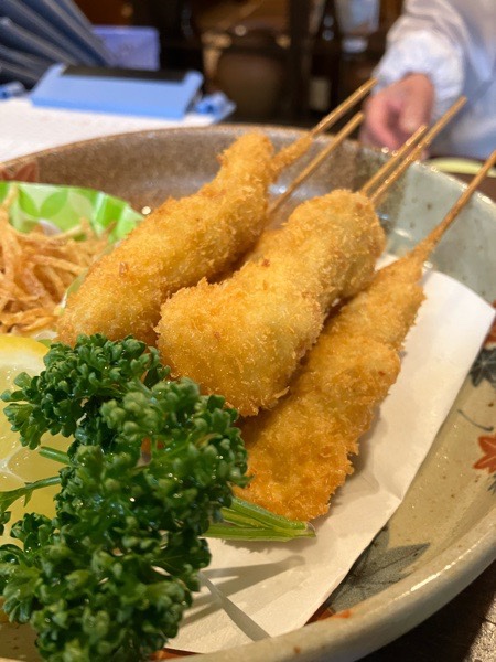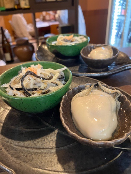 河豚皮ポン酢と煮る牡蠣の お通しから♪( ´θ`)ノ