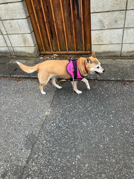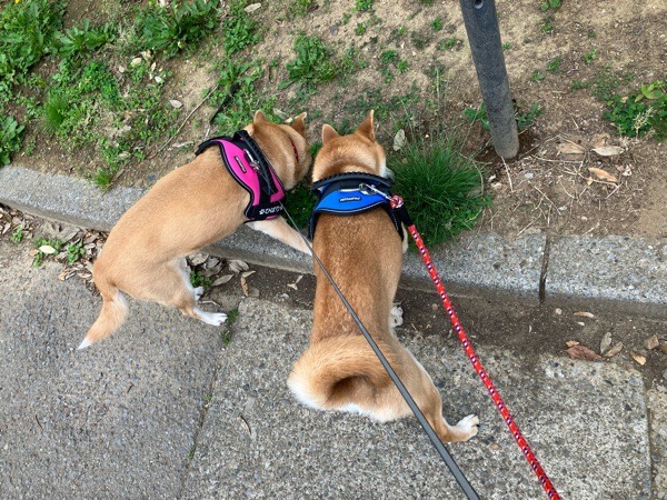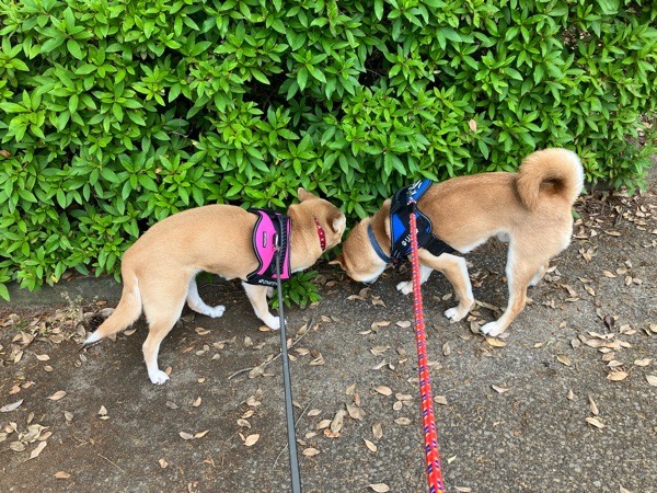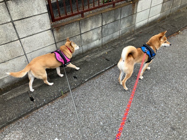 道路の端っこを真っ直ぐ歩くヒバ子さんと、チョロチョロ蛇行して歩くリリ君🐕